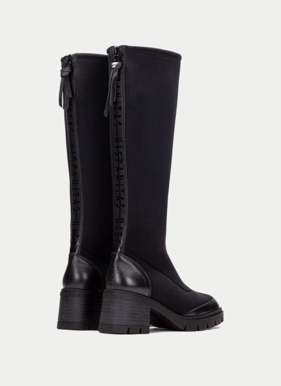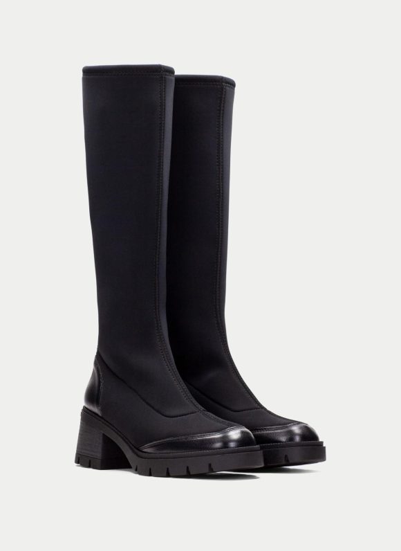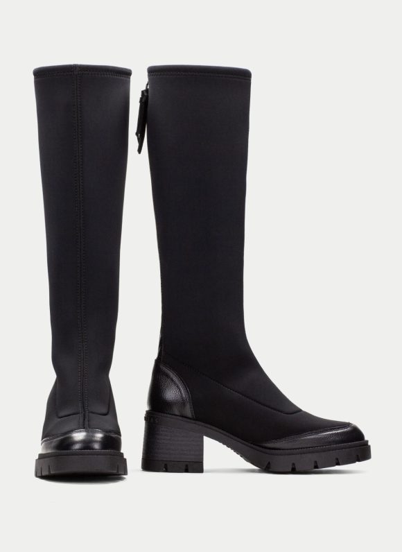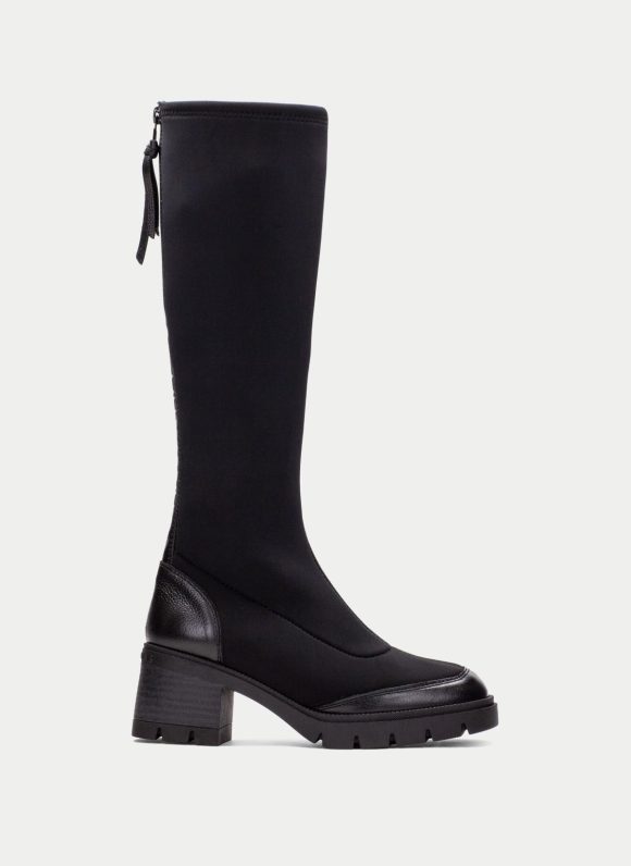 Bota de caña alta fabricada en piel y material elástico. Cremallera en la parte trasera y tacón bloque de 6,5 cm de altura. Detalle de suela track y punta redonda. Este zapato incorpora la tecnología Triflow, amortigua cada paso aportando flexibilidad y confort en la pisada, gracias a su triple almohadillado.