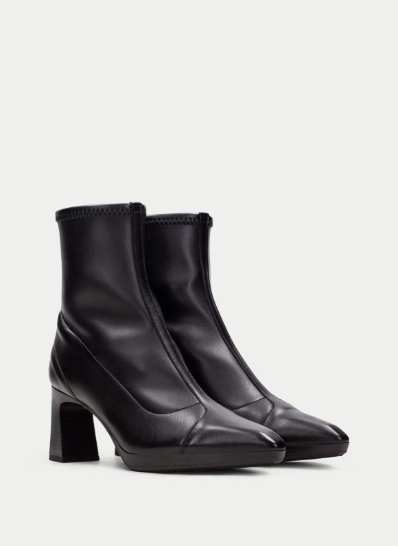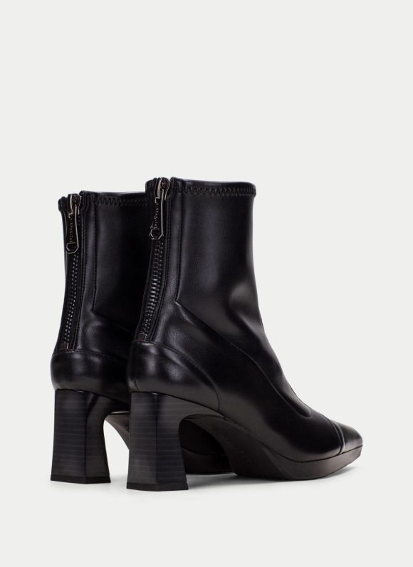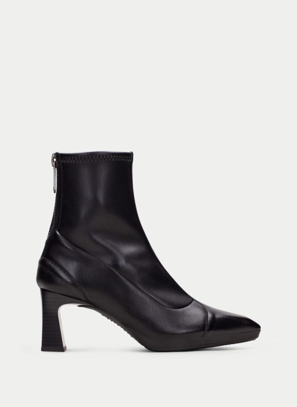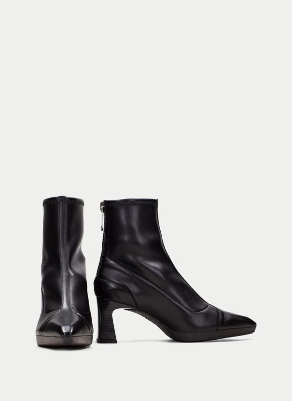 Botín de tacón de 7 cm en combinación de materiales y punta fina con diseño strech que permite un perfecto ajuste al pie. Tacón fino y cierre de cremallera en la parte trasera. Este zapato incorpora la tecnología Triflow, amortigua cada paso aportando flexibilidad y confort en la pisada, gracias a su triple almohadillado.