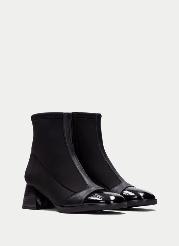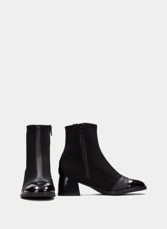 Botín con tacón bloque y punta redonda de charol. Cierre de cremallera en el empeine con el nombre de la marca. Este incorpora la tecnología TRIFLOW y además cuenta con plantilla extraíble.
